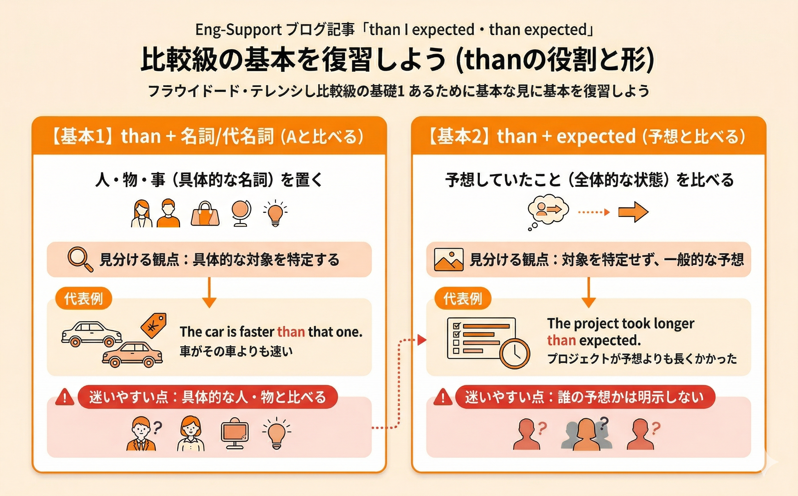 比較級は「~よりも~だ」という関係を表します。例えば、”Jiro was more surprised than Tom was.”という文では、Jiroの驚きがTomよりも大きかったことを示しています。