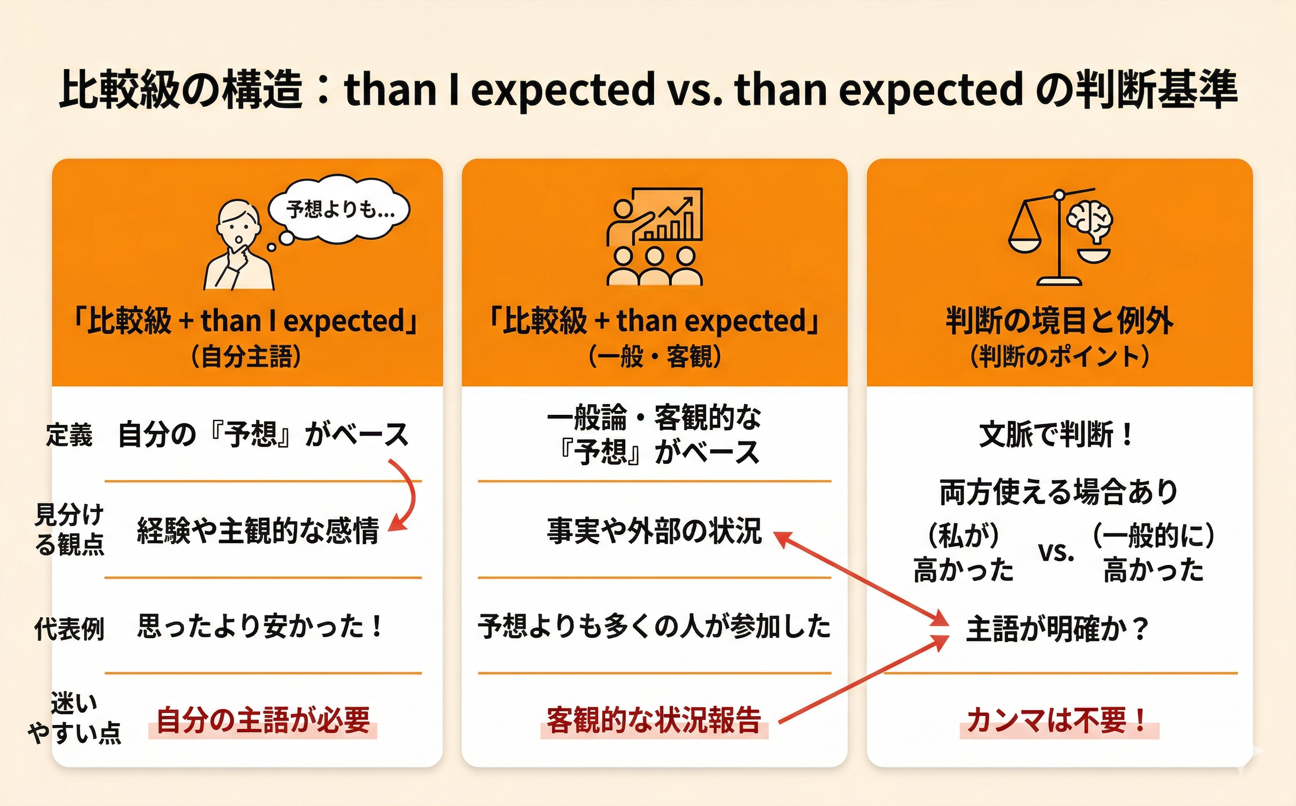 “than I expected”は、「私が予想したよりも」という意味を持ちます。実際には、”expected“は過去完了形の”had expected”が一般的ですが、PROGRESSでは過去形で表現されていることが多いです。