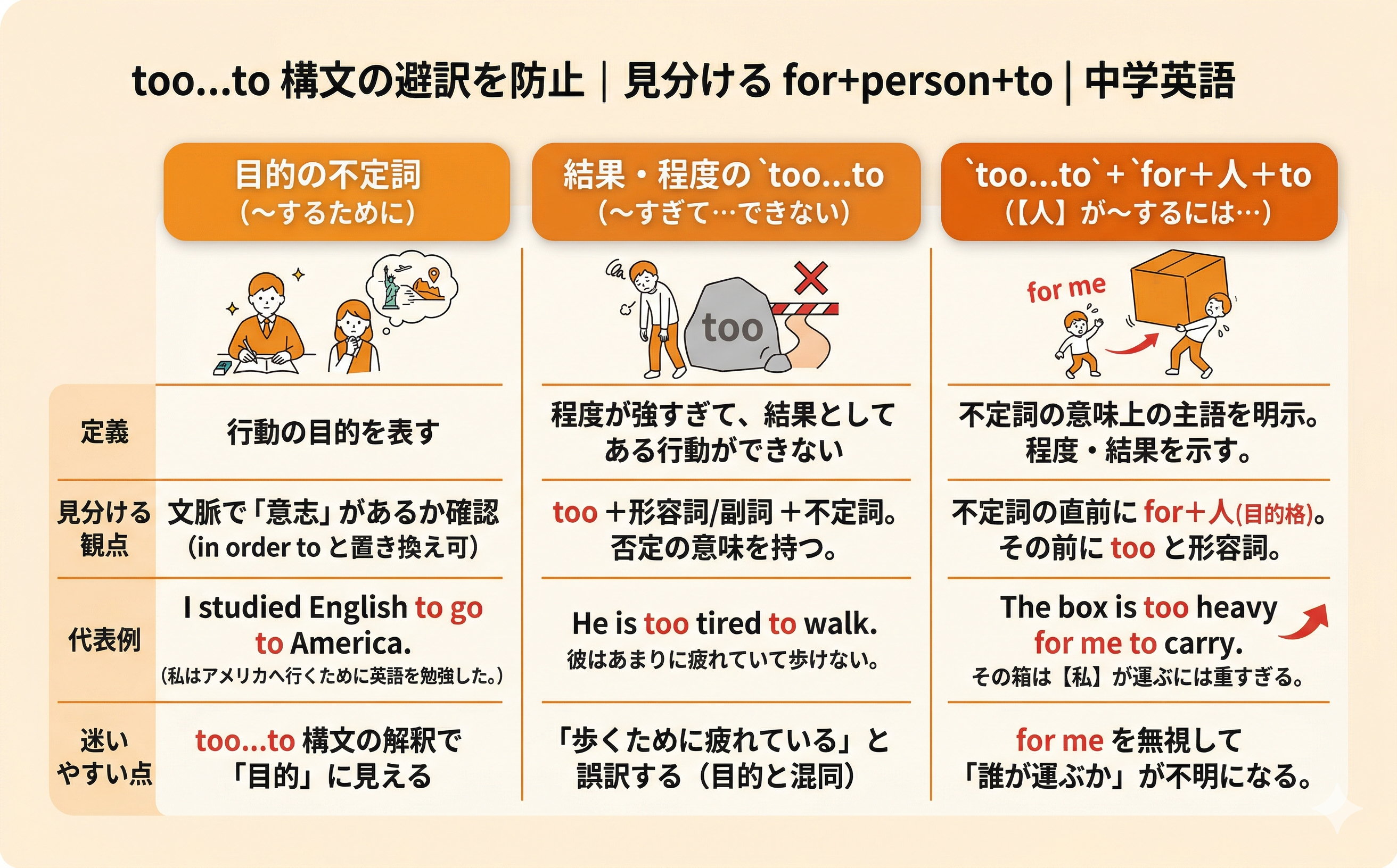 too…to は訳せるのに、for+人+to が入った途端に意味がズレる――多くの人がここで止まります。
