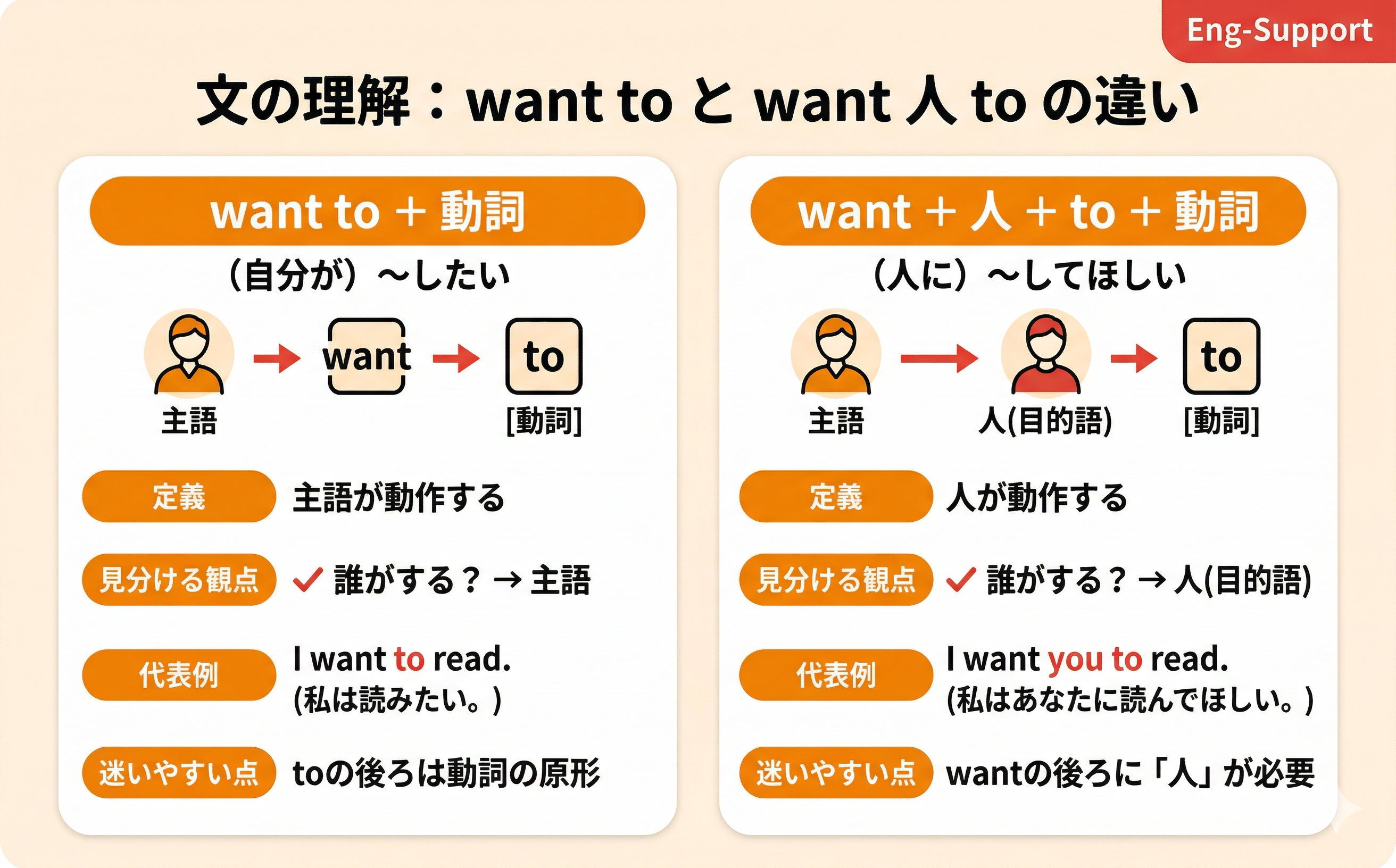 「want 人 to V」は、意味で覚えるより形(SVtOC)を押さえると読み間違いが止まります。