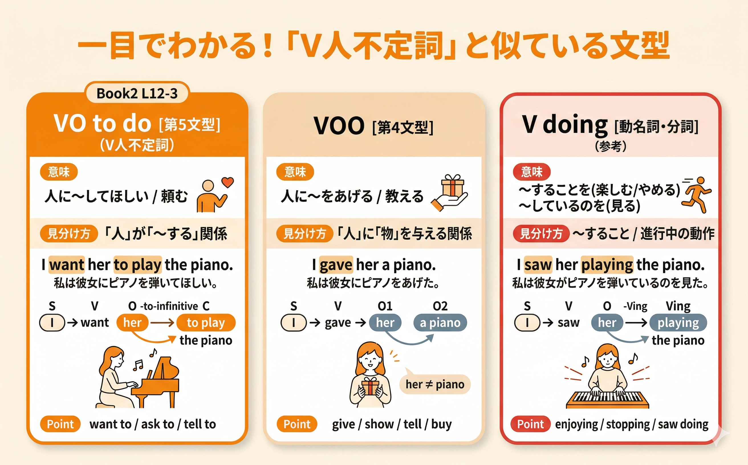 判定のコツ:動詞の直後に「名詞(人)+to V」が来たら、まず第5文型を疑います。