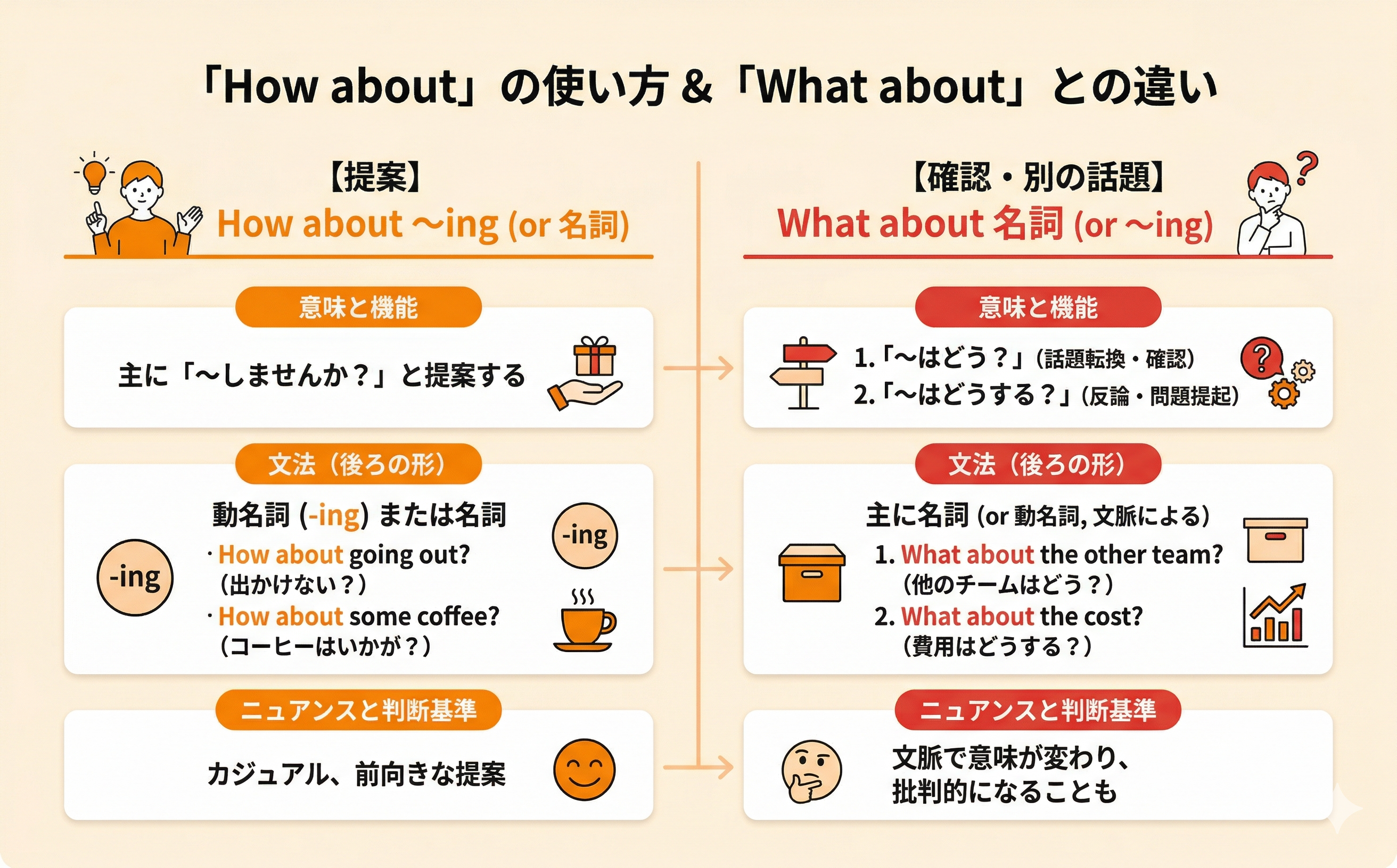 「How about」の文に関して気を付ける点があります。「getting」は動名詞ですが、動詞としての役割が完全ではありません。これは50%が動詞、50%が名詞の性質を持っているため、100%の動詞は存在しません。中学1年生で学んだように、通常英語の文には動詞が必要ですが、この文には動詞がない特別な構造です。この点をしっかり覚えておきましょう。
