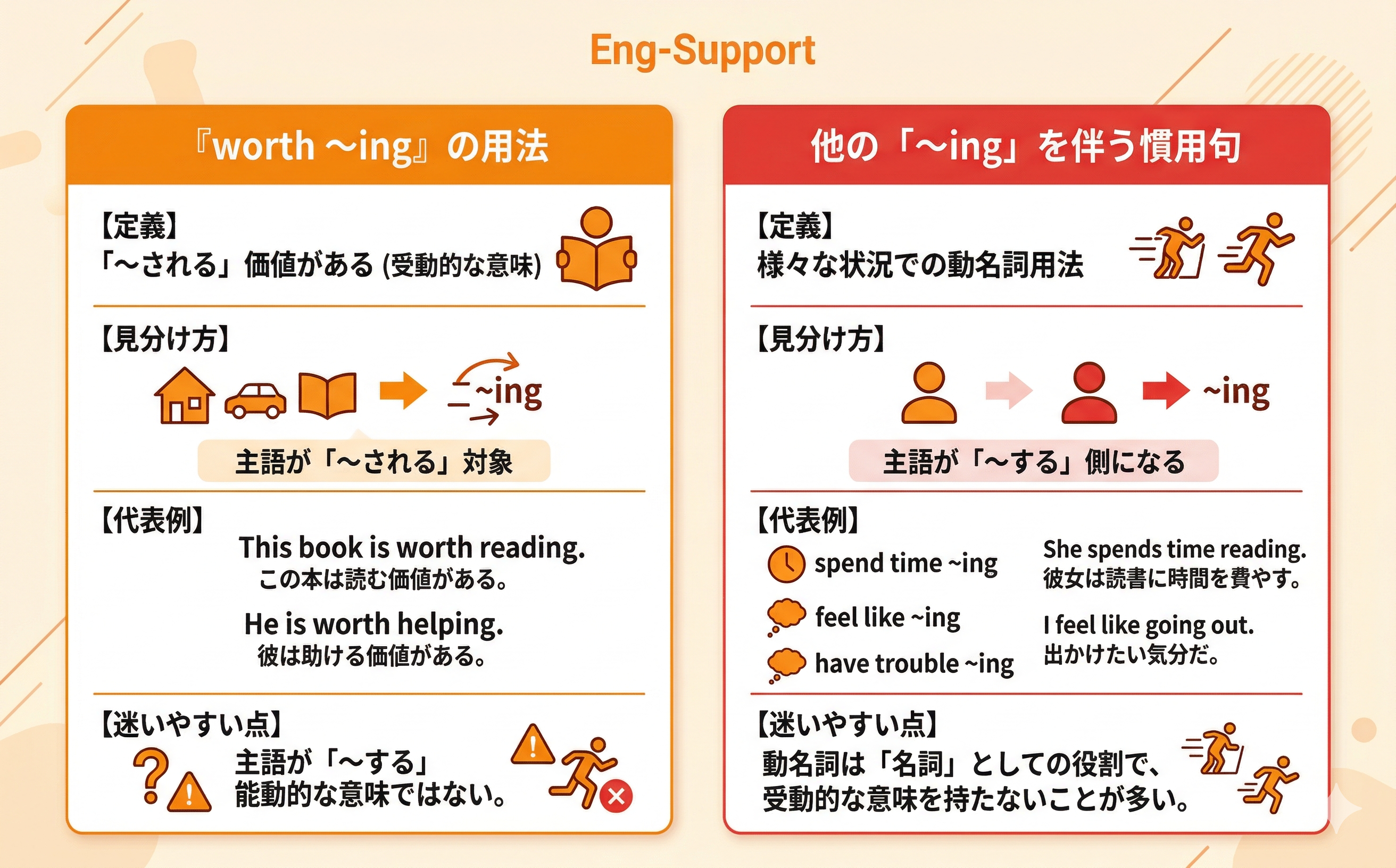 worth ~ing は「〜する価値がある」という意味ですが、意味だけで覚えると worth to do と書きたくなりやすい表現です。このページでは、worth の品詞、後ろが ing になる理由、it を入れない形まで Book2 Lesson13 Scene3 に沿って確認します。
