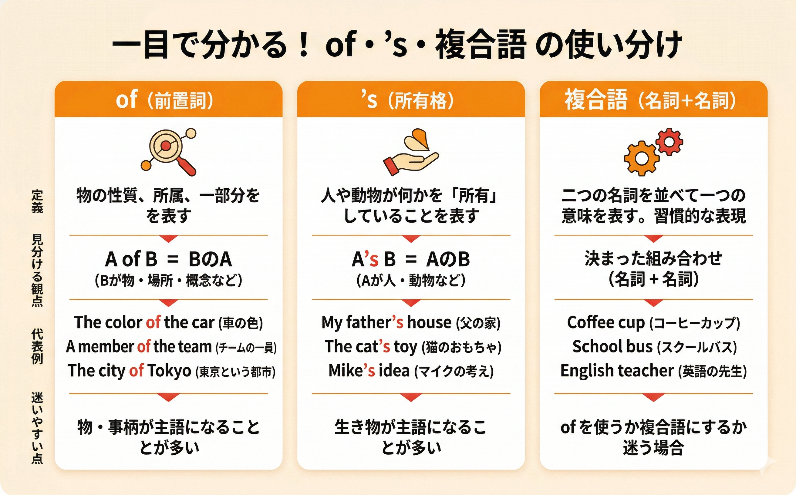まずは、いちばん混乱しやすい「所有(’s)」と「of(~の)」の言い換えから確認しましょう。