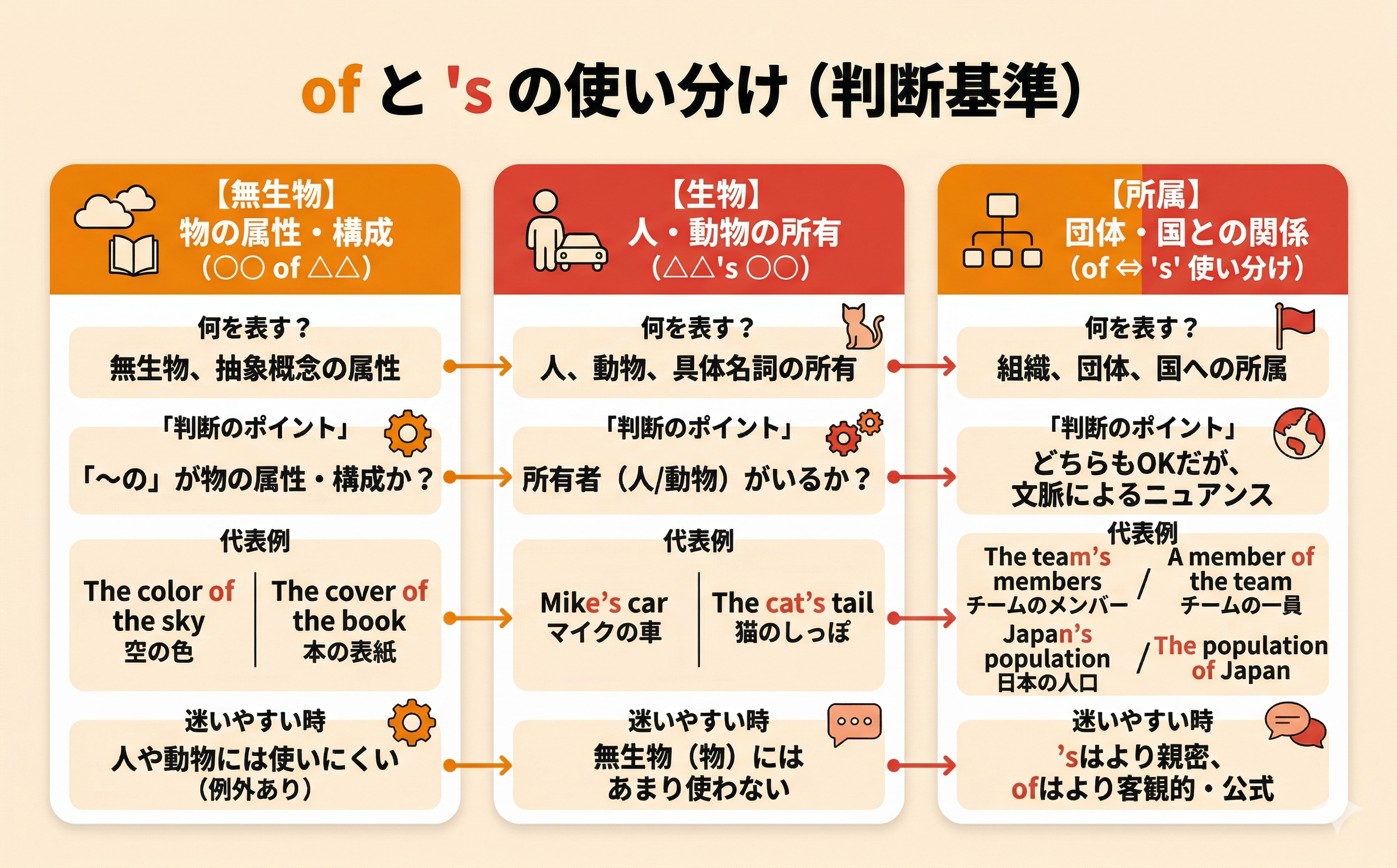 ’s(人・生き物)とof(長い主語/説明を後ろに付ける)の感覚をそろえます。